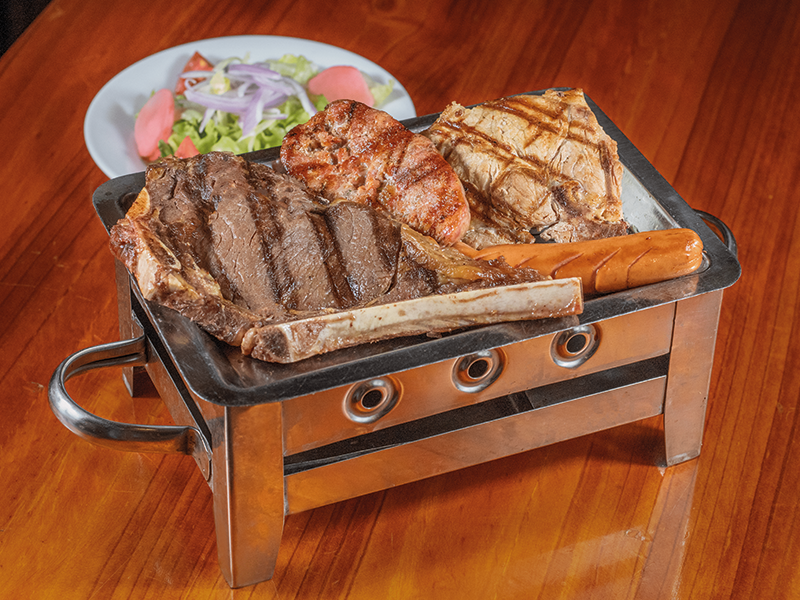 1 churrasco tradición + brocheta o chuleta (150gr) + 1 chorizo + 1 hot dog + papas premium + ensalada parrillera